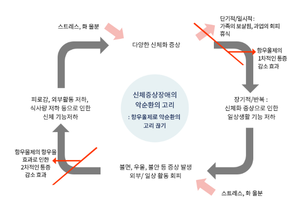 일명 '화병'은 속상함, 분노, 증오, 우울등 정서적 증상과 가슴통증, 열감, 답답함 등 신체 증상이 동반되어 나타납니다. 우울장애와 신체증상장애의 복합적인 상태로 볼 수 있습니다. 따라서 신체증상이 우울 및 불안을 더 심각하게 하고, 불안 및 우울은 외부활동에 대한 의욕을 낮추면서 이로인해 피로감, 근육 위축 등의 신체증상이 더욱 악화됩니다. 이것이 신체증상장애의 악순환의 고리입니다.